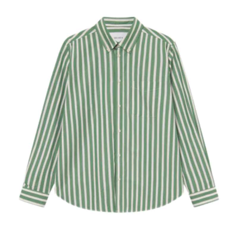 A loose-fit shirt cut from soft washed organic cotton poplin, detailed with a timeless stripe pattern. Designed with a button-down collar, chest pocket, and a box pleat at the back for ease of movement. Finished with a front placket and adjustable cuffs.