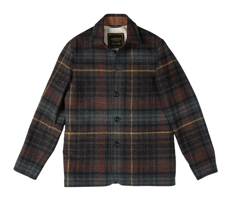 SAMSON brings you this classic chore coat stepped up in style w/ a tartan tweed. Made in London, England, the 100% wool tartan lends the look of a blazer to dress it up or down. Fully lined...body in cotton muslin and interior sleeves w/ viscose. Undercollar is brown suede for a striking look when popped up.