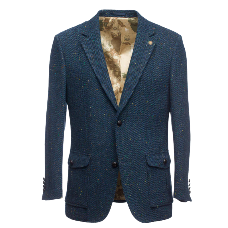 This plain Donegal tweed patterned fabric has been designed to reignite your tweed jacket collection. This tweed blazer has a blue tonal composition making it perfect for both day and evening events. Cut with quirky design details, it has been designed with a nod to Irish historical events. This fabric champions versatility offering an all year round appeal. Sustainably made in the seaside town of Balbriggan in North Co. Dublin. This 500 gram cloth has been uniquely milled to emphasize structure in our jacket. Style with our handwoven WB Yeats Tweed Waistcoat. Wear a piece of Irish Heritage today.