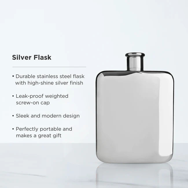 Polished to a brilliant silver, this high-shine stainless steel flask is liquid-tight and crowned with a weighty, equally lustrous cap to hold any desired liquor.