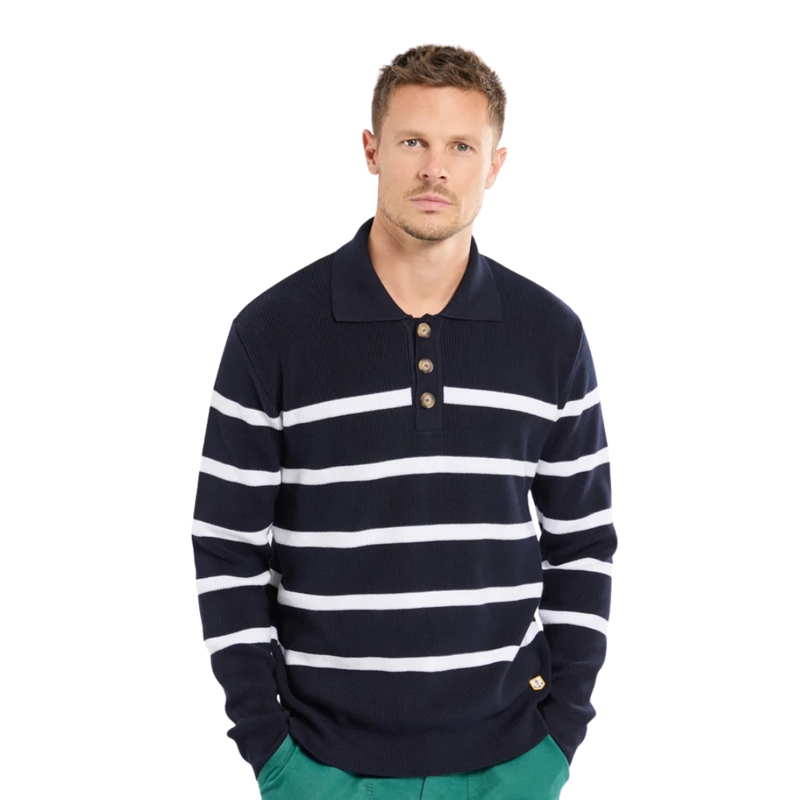 This 100% cotton striped sweater has a button-down collar that can be worn open or closed.