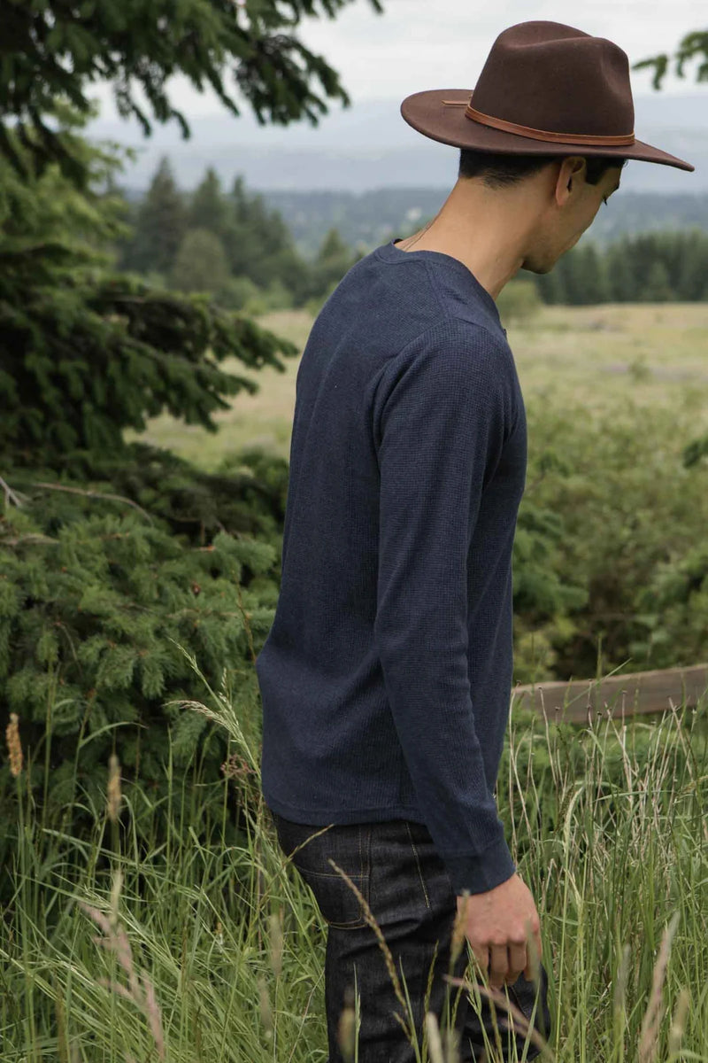 A true classic, updated with a modern fit, this waffle-knit henley is crafted from 100% recycled fibers using a proprietary color-sorting process that eliminates the need for dyes and drastically reduces water use. With its insulating waffle-knit texture and flattering silhouette, this piece is perfect layered under a flannel or worn solo on mild days. When used as a layering piece, the thermal waffle structure traps warmth without bulk, those small, square-shaped pockets hold heat close to the body while still allowing airflow for all-day comfort. Soft, sustainable, and made to last - this is your everyday go-to, done right.
