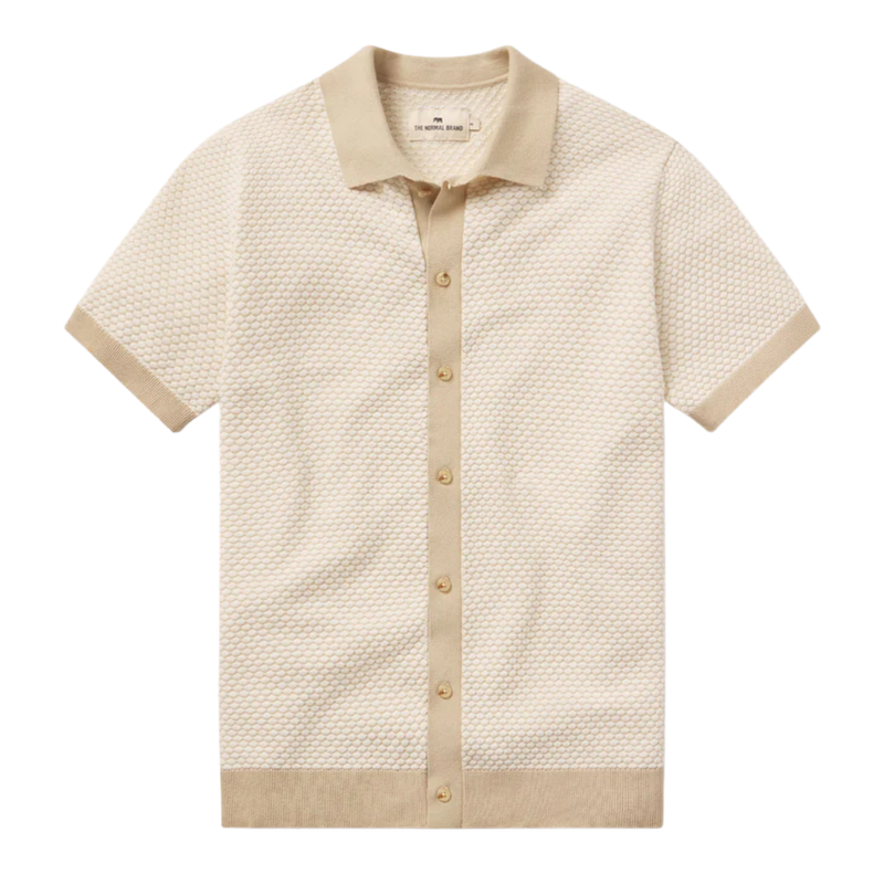 Vintage charm meets modern comfort. This button up is a true-to-size, lightweight knit shirt made from 100% Cotton Robles Yarn. It has a soft, classic cotton feel with a subtle stretch. It features an all-over novelty micro float jacquard pattern in two-tone colors for extra dimension. Key details include a contrast color rib collar, a rib center front placket with button entry, inset sleeves, and contrast color rib cuffs and bottom band. Finished with dyed-to-match marled buttons, this piece blends comfort and style with a touch of texture.