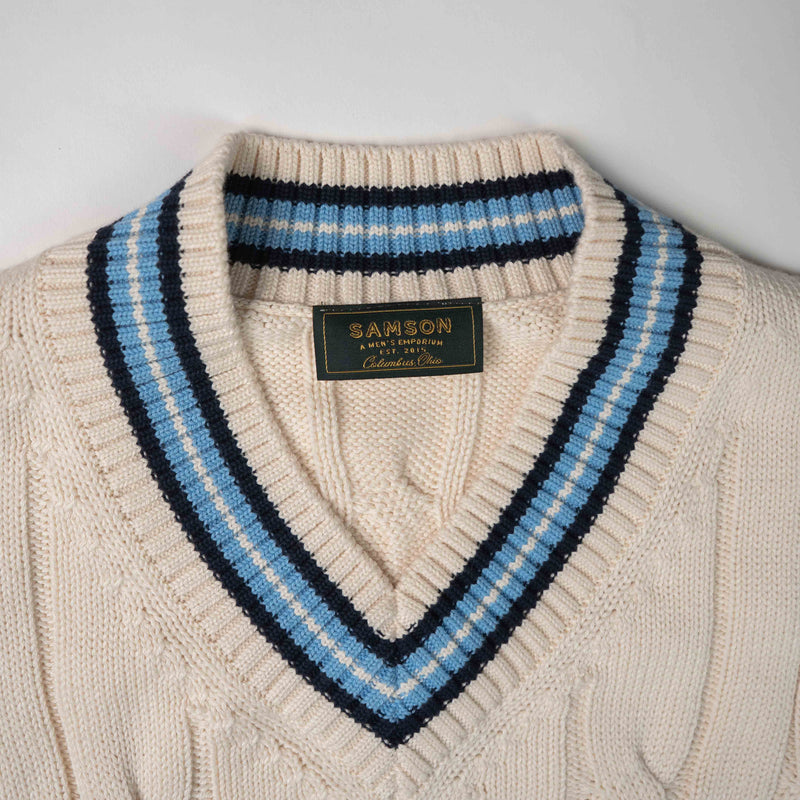 SAMSON brings you this classic V-neck in a cream Supima Cotton made in Peru by a 4th generation knitting factory. The striping detail is along the neck and the waist of the sweater.
